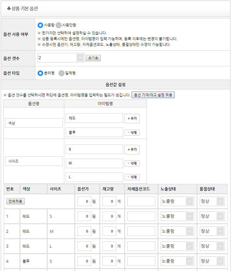 옵션명과 아이템명을 입력 및 추가하고 옵션 가격/재고 설정 적용 버튼을 클릭하면 하단에 옵션가, 재고량 등을 입력할 수 있게 세팅됩니다.